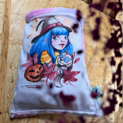 Bolsa de calor con semillas de lino y lavanda con una ilustración original de María Cabañas.
